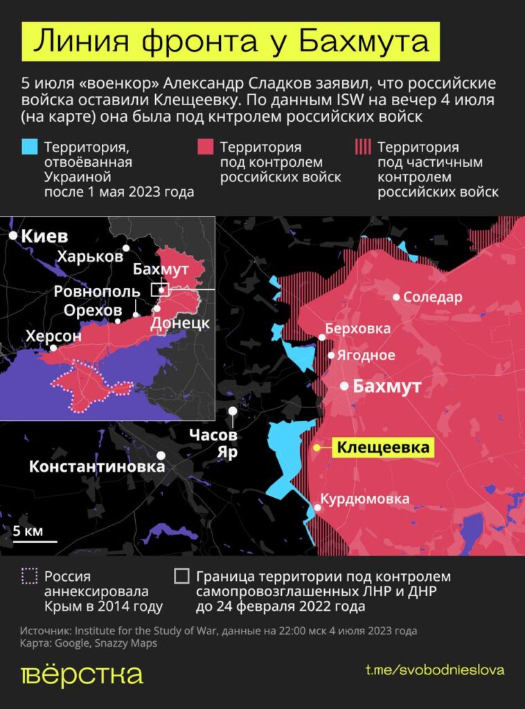 Кроме того, украинские военные пытаются занять северный и южный фланги Бахмута. По этому направлению в последние дни сообщалось об активных боях в районе села Клещеевка, что находится на 5 км южнее города. 5 июля «военкор» Александр Сладков заявил, что российские войска оставили это поселение, тем самым открыв для ВСУ одну из южных дорог на Бахмут. Однако украинские военные полное взятие села пока не подтвердили: в Генштабе ВСУ заявили, что «имеют частичный успех, закрепляются на достигнутых рубежах».