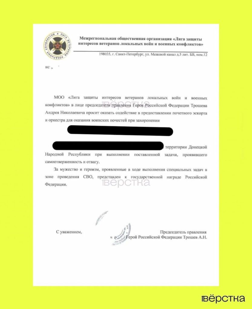 Представители ЧВК «Вагнера» начали распространять по местным администрациям письма с требованием предоставлять на похоронные церемонии своих бойцов «почётный эскорт» и «оркестр». Обращение отправляется от имени одного из руководителей ЧВК Андрея Трошева, которого представляют как Героя России и лидера близкой Евгению Пригожину общественной организации «Лига защиты интересов ветеранов локальных войн и военных конфликтов». В случае отказа со стороны местных властей представители ЧВК просят родственников погибших «присылать данные» не пошедших на сотрудничество чиновников.