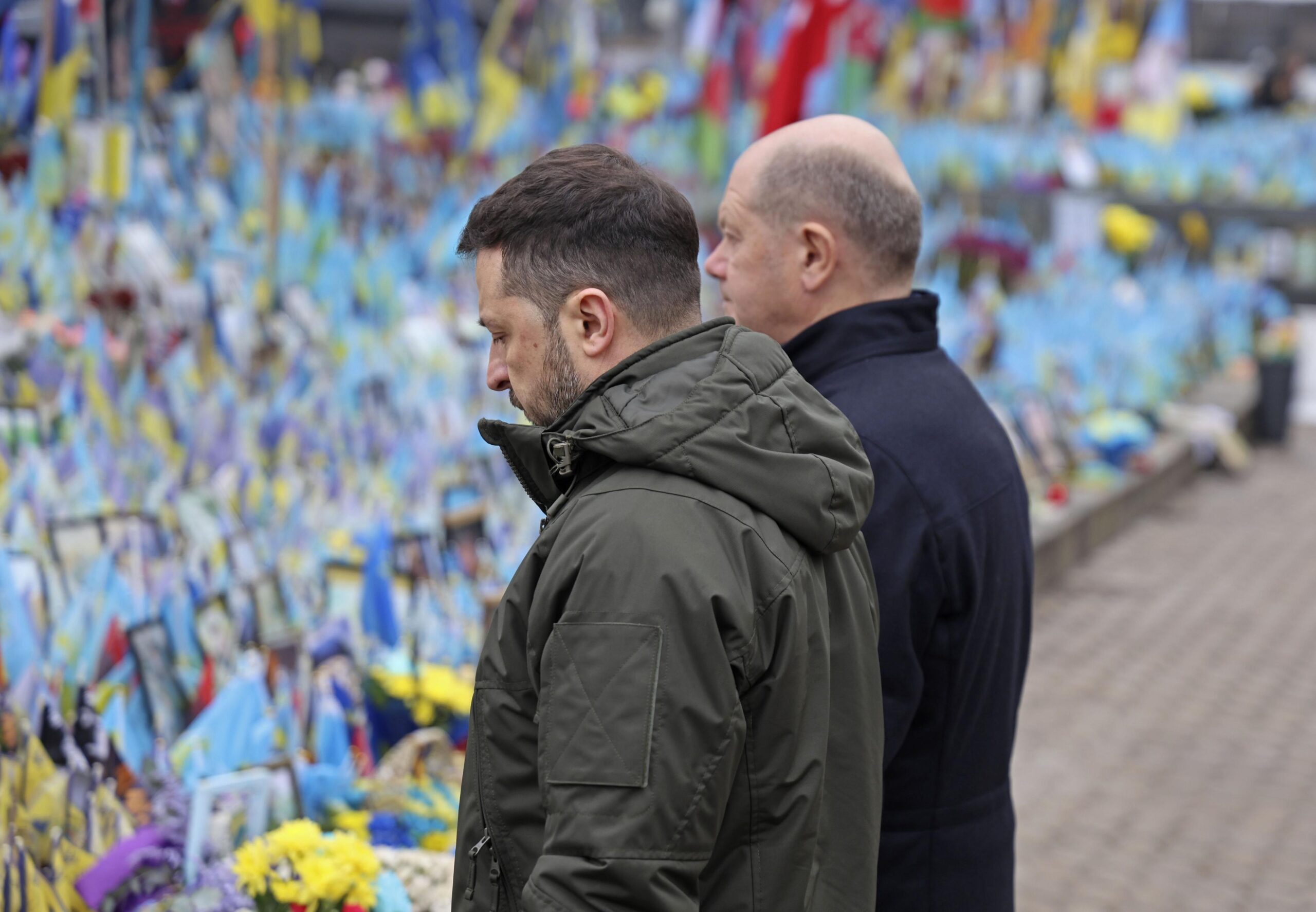 Фото: Канцлер Германии Олаф Шольц и президент Украины Владимир Зеленский у мемориала жертвам войны в Киеве. 2 декабря 2024 года. Kyodo via Reuters Connect