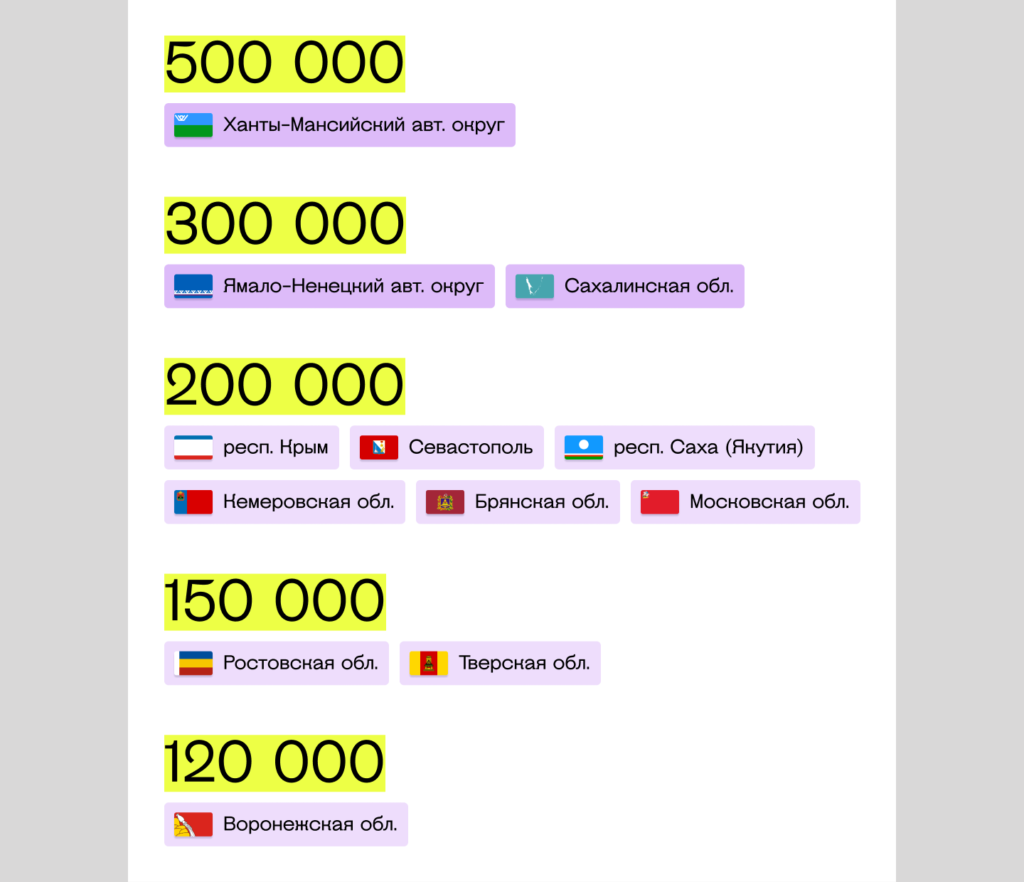 Самую большую сумму — в 500 тысяч рублей на человека — выделили власти Ханты-Мансийского автономного округа. Выплата разбита на две части, половину обещают перевести сразу после заключения контракта, а вторую — после его завершения.