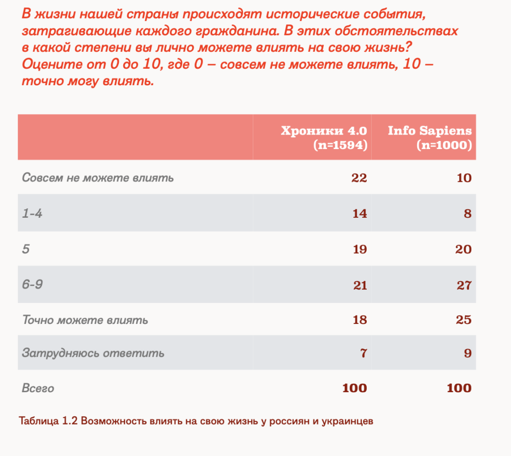 При этом в Украине всего 10% респондентов сказали, что, по их ощущениям, они совсем не могут влиять на свою жизнь. Впрочем, это показатель по стране в целом. В восточных регионах ситуация отличается — на Востоке 22% украинцев сказали, что у них нет контроля над собственной жизнью, на Юге — 19%. И все равно ни одно из этих значений не превышает российского — получается, что в «безопасной» стране ощущение контроля над своей жизнью у участников примерно такое же, как в регионах, где идут активные военные действия.