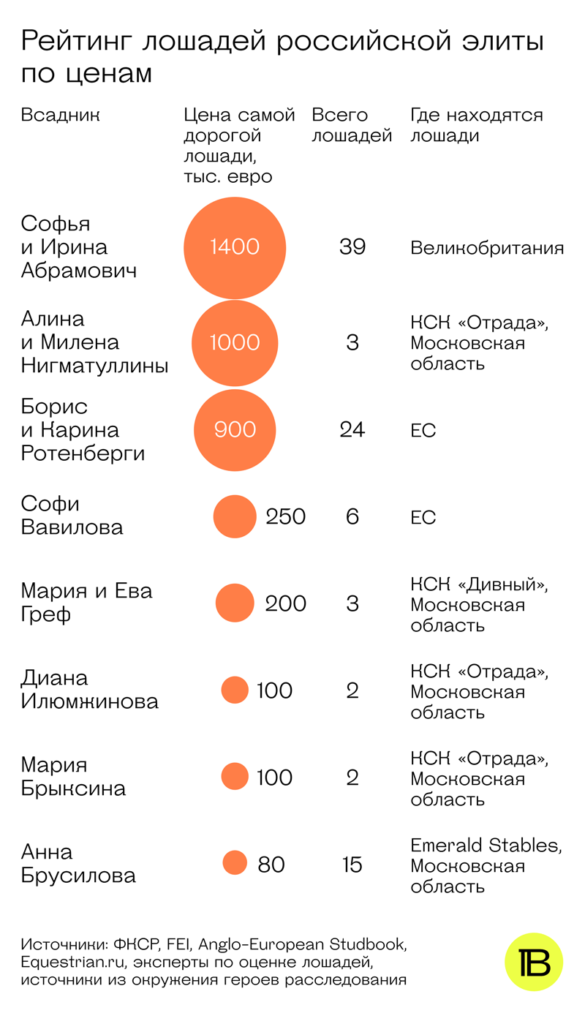 Мы составили рейтинг лошадей российских олигархов и чиновников по ценам. Этих лошадей мы обнаружили с помощью специальных конных реестров, в которых указаны владельцы, результаты соревнований и другие сведения о лошадях и всадниках (ФКСР, FEI, Anglo-European Studbook, Equestrian. ru). Определить цену нам помогли источники из окружения героев нашего расследования и эксперты по оценке лошадей. Цена на одну лошадь колеблется от 80 тысяч до 1,4 млн евро.