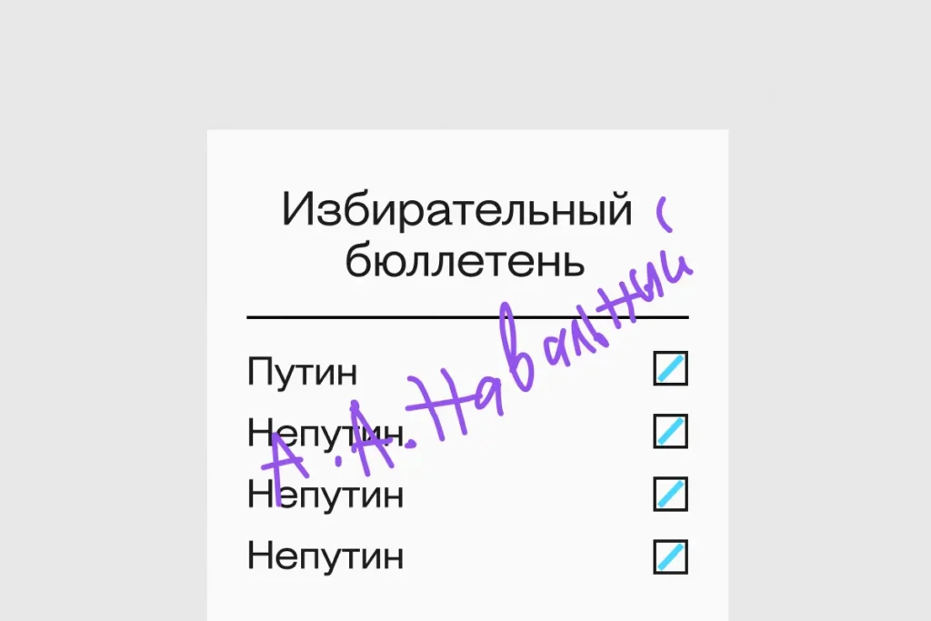 Единственный предложенный оппозицией законный способ публично выразить протест против Путина и войны — это участие в акции «Полдень против Путина». Для этого нужно прийти на свои избирательные участки 17 марта в 12.00, при этом совершенно не принципиально, что делать со своим бюллетенем — главное не отдавать голоса за Путина. К примеру, оппозиционные политики Михаил Ходорковский и Дмитрий Гудков предлагают вписывать в бюллетени фамилию погибшего в феврале Алексея Навального, ставить «галочку» за любого кандидата либо портить бюллетень.