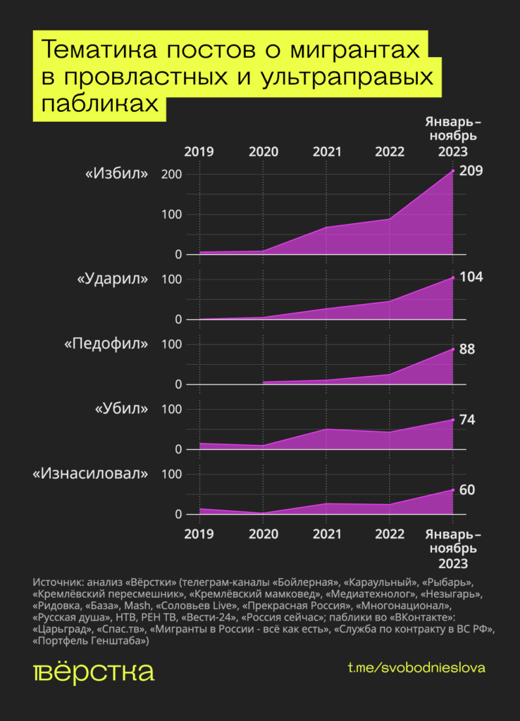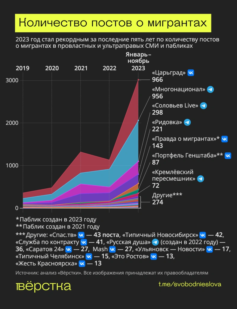 Часть из них, как выяснила «Вёрстка», посвящают теме мигрантов не более 2–3 постов в год, и 2023 год никак не изменил эту тенденцию. Другие, напротив, во втором полугодии 2023 года стали намного активнее, чем обычно, писать о мигрантах. Среди них — провластные и консервативные СМИ, некоторые региональные новостные паблики и ультраправые сообщества в Тelegram и «Вконтакте».
