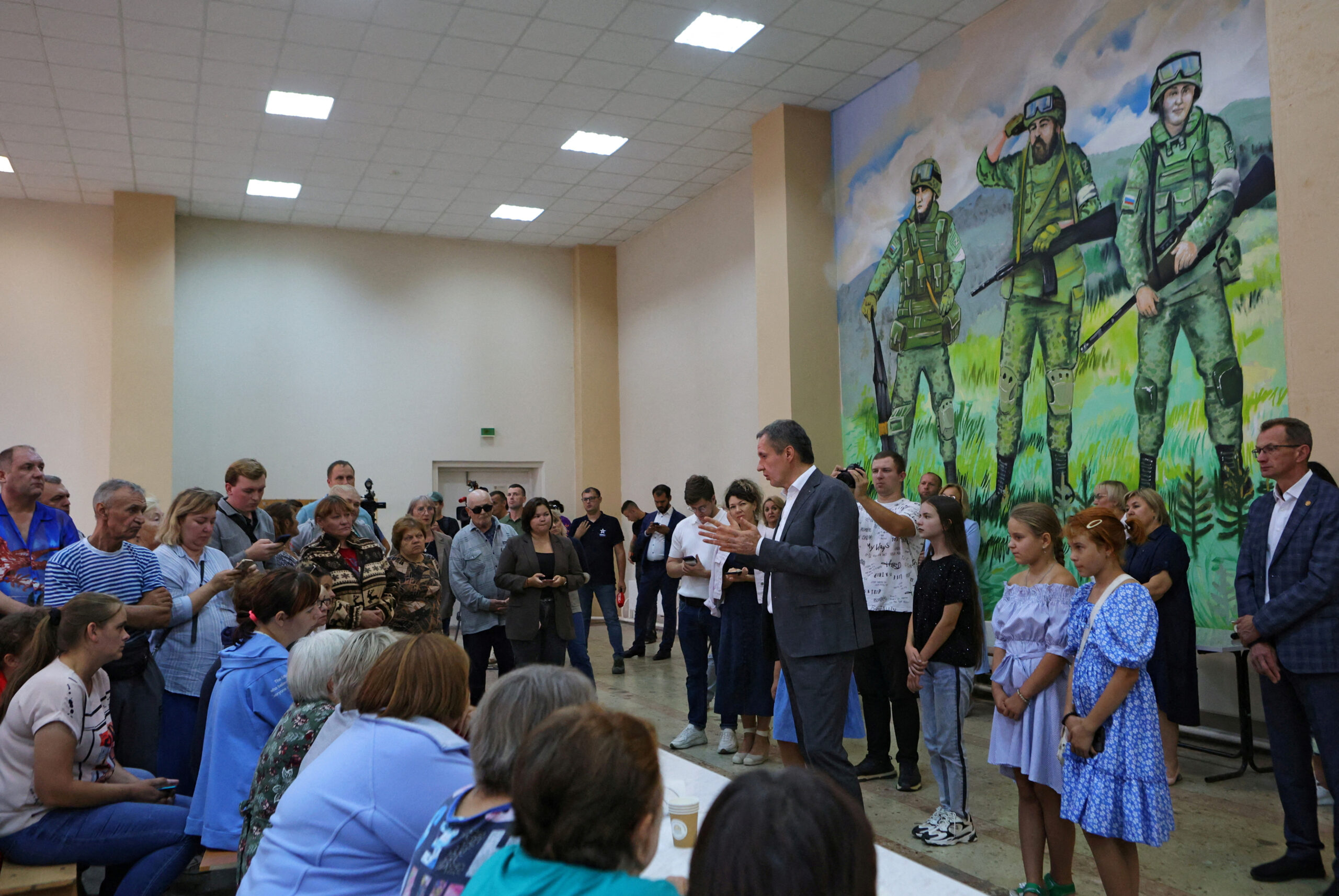 Фото: Губернатор Белгородской области Вячеслав Гладков общается с беженцами из приграничных районов Белгородской области, эвакуированными в Старый Оскол, 14 августа 2024 года. REUTERS/Stringer REFILE