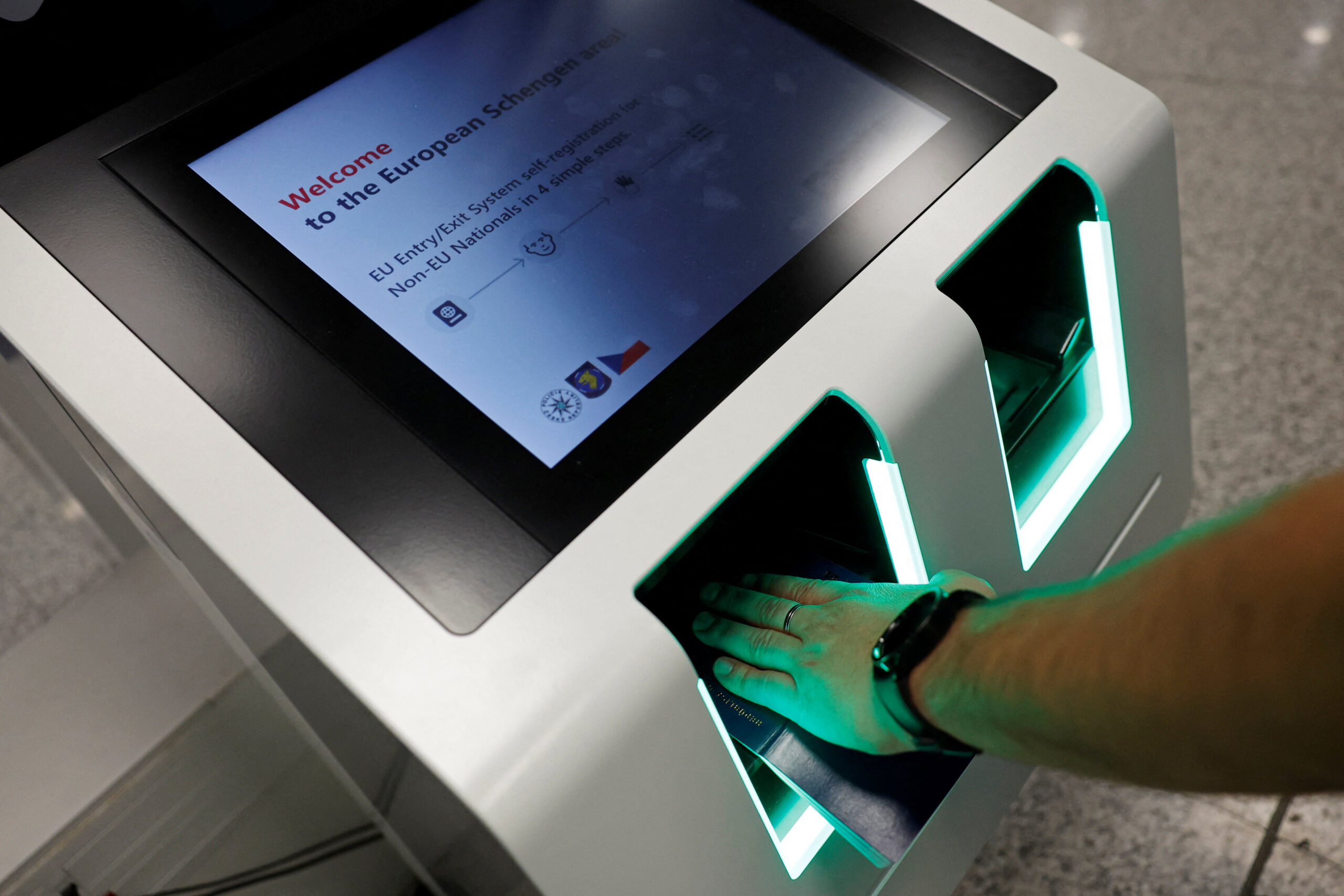 Фото: Полицейский сканирует паспорт во время демонстрации автоматизированного терминала для регистрации в системе въезда/выезда (Entry/Exit System, EES), которая обязывает всех граждан стран, не входящих в ЕС, при первом въезде в Шенгенскую зону предоставлять персональные данные, включая отпечатки пальцев и изображения лица. Аэропорт Вацлава Гавела в Праге, 14 октября 2025 года. REUTERS/David W Cerny