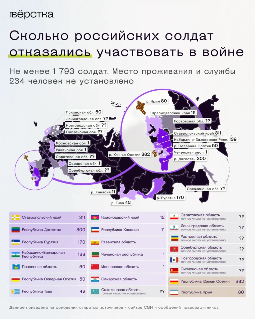 По данным российских правозащитных организаций и СМИ, с начала войны служащие из 22 регионов сообщили о том, что не хотят воевать. «Вёрстка» посчитала все случаи, о которых стало известно с конца февраля: по открытым данным, как минимум 1 793 россиянина заявили, что хотят сложить оружие (подробное описание расчётов — в последнем блоке материала. — Прим. ред.).