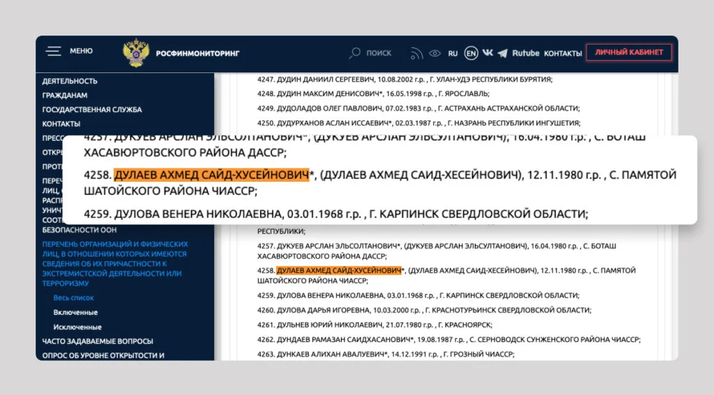 Самым молодым из перечня Росфинмониторинга в опубликованном списке чеченских добровольцев оказался 28-летний Алхаст Идалов из Чечни под номером 1885. В перечне террористов мужчина находится с февраля 2020 года. Судебное решение, связанное с его включением в этот список, найти не удалось. О возбуждённых против него уголовных делах также неизвестно.