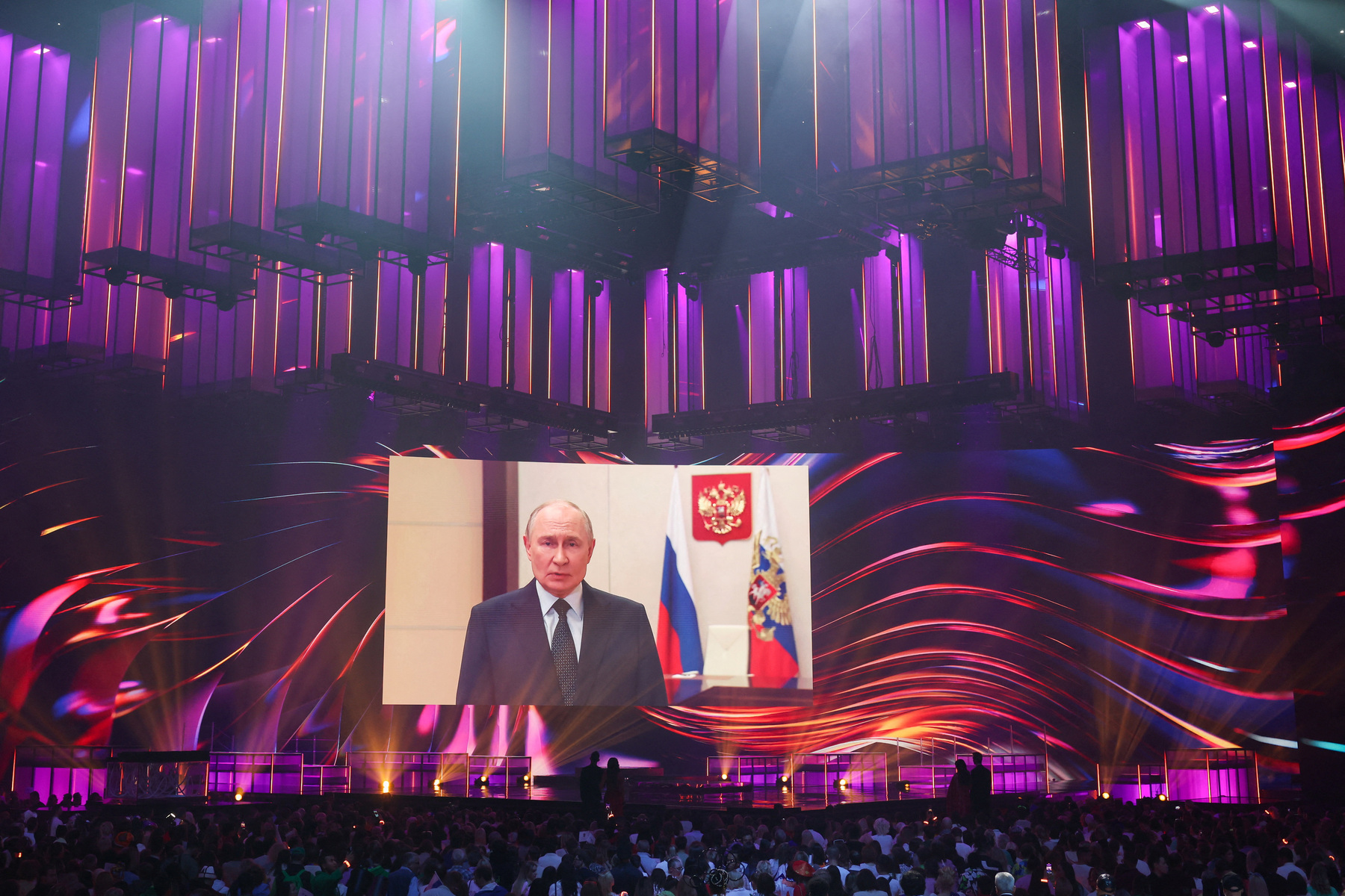 Зрители смотрят видеообращение Владимира Путина во время открытия конкурса «Интервидение 2025». 20 сентября 2025 года. REUTERS/Evgenia Novozhenina
