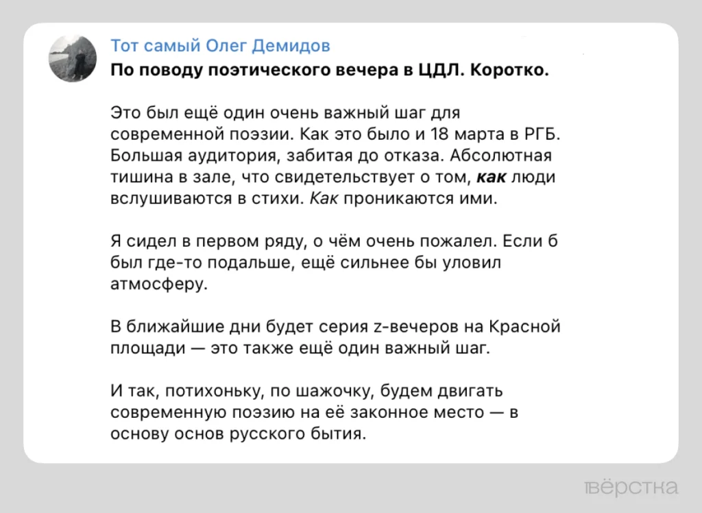 За 10 минут до начала концерта петербургский Z‑поэт и писатель Александр Пелевин, называющий себя метамодернистом, лауреат «Нацбеста-2021» за роман «Покров-17», опубликовал в Telegram снимок с длинной очередью на вход и написал: «Очередь в ЦДЛ на никому не нужных и неинтересных ватных зэт-поэтов. Опять пустыня!»