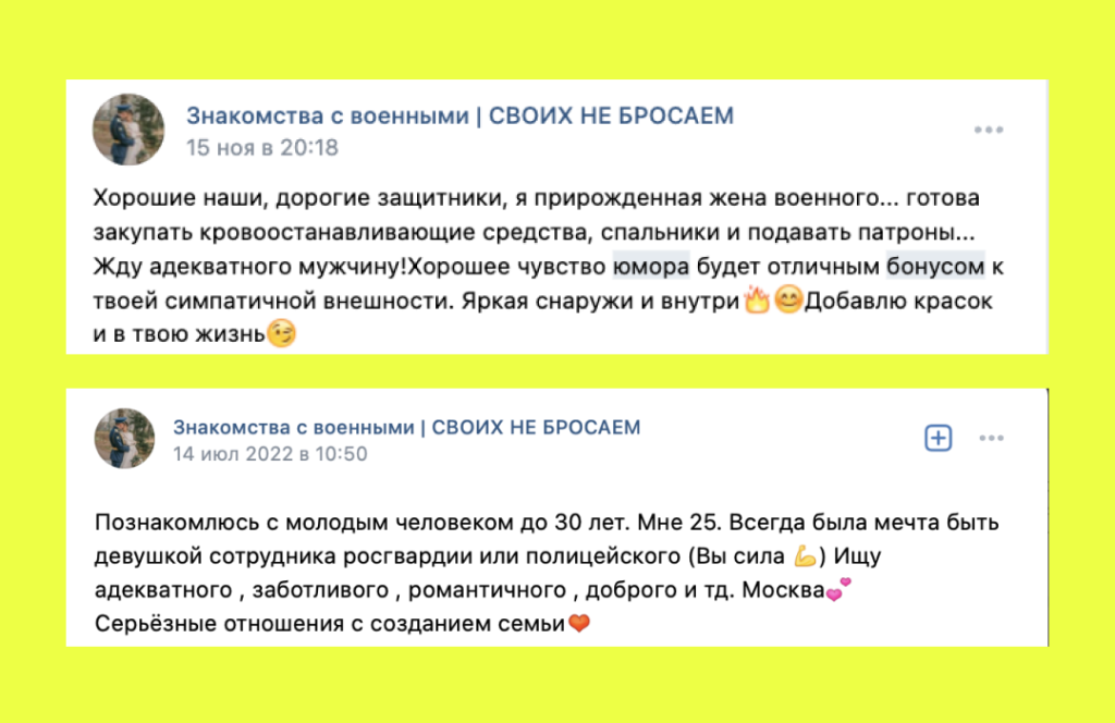 На фоне войны во «ВКонтакте» стали активно развиваться сообщества, где россиянки пытаются познакомиться с военными. «Вёрстка» нашла около 30 таких групп, в самой многочисленной — 23 тысячи участников. С весны в ней каждый день появляются десятки постов от женщин из разных регионов. Они публикуют свои фотографии и рассказывают, как далеко готовы уехать за военнослужащим, какими качествами должен обладать их будущий супруг и к какому военному подразделению он должен принадлежать. О себе и о своих требованиях к женщинам в группе пишут и сами военные.